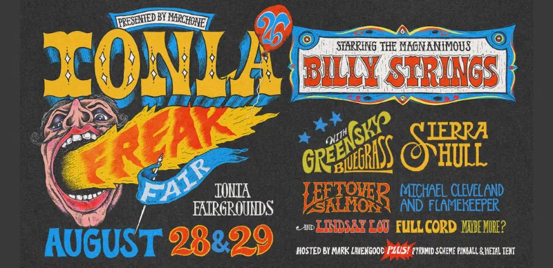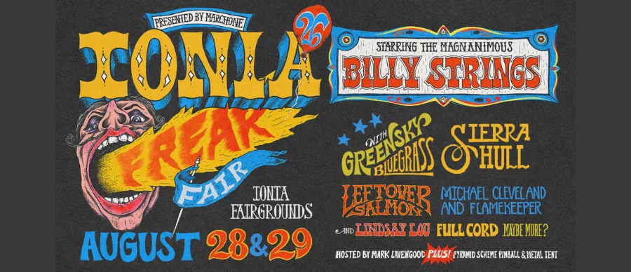 Ionia Freak Fair August 28-29, 2026 Ionia Fairgrounds Lineup: Billy Strings, Greensky Bluegrass, Leftover Salmon, Sierra Hull, Michael Cleveland and Flamekeeper, Lindsay Lou, Full Cord... maybe more? Hosted by Mark Lavengood. Plus: Pyramid Scheme Pinball & Metal Tent Tickets and info: www.ioniafreakfair.com 3x Gra...